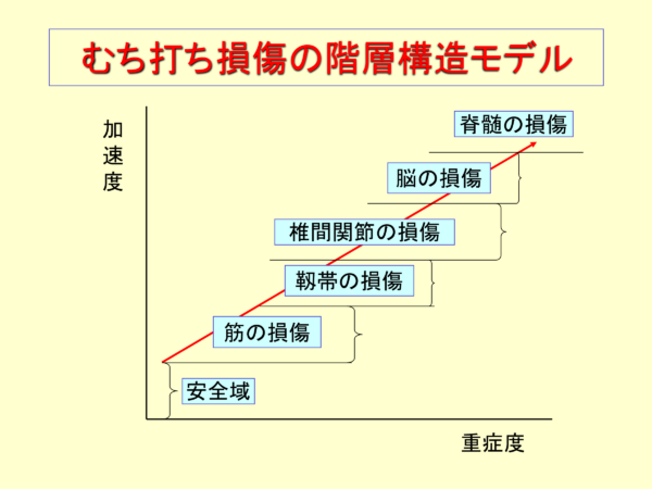 図2は実験的に色々な組織にストレッチを加えて損傷するまでの力を測定したものです。縦軸は引っ張り加速度の強さで、横軸は損傷されやすい組織の順番です。これによると筋肉は他の組織に比べ引っ張り加速度が一番弱くても損傷を受けてしまいます。