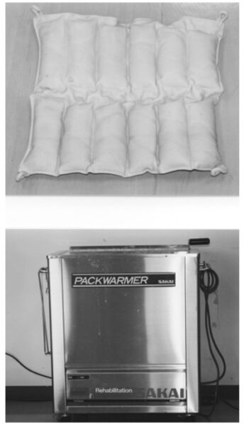 ホットパックは循環を改善し、特に湿生のホットパックはとても気持ちのいいものです。疼痛に対してや関節の動きが悪い患者さんを治療する前に適応する方法が良く採られます。電気で温めた乾性ホットパックもあります。