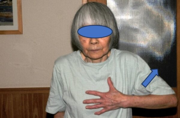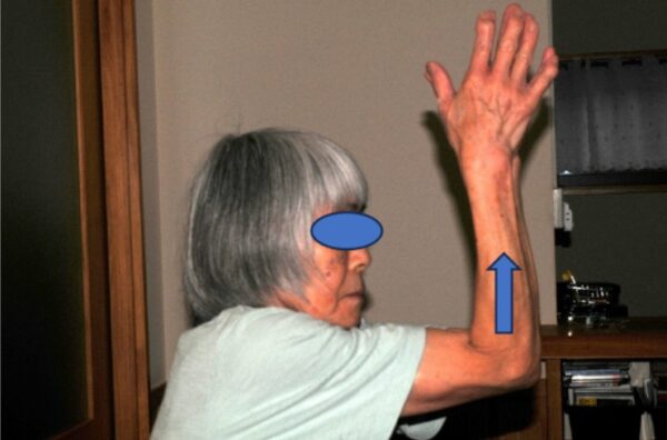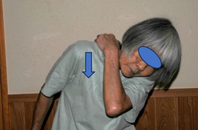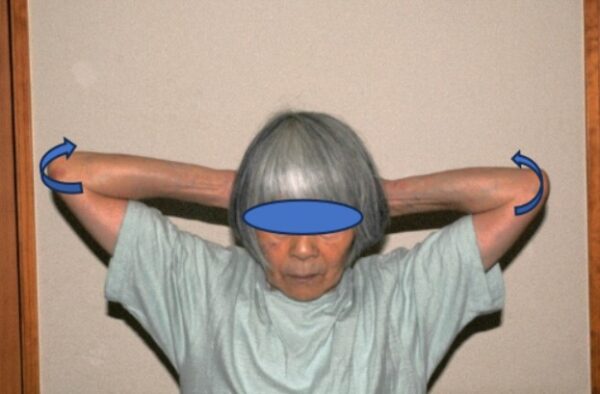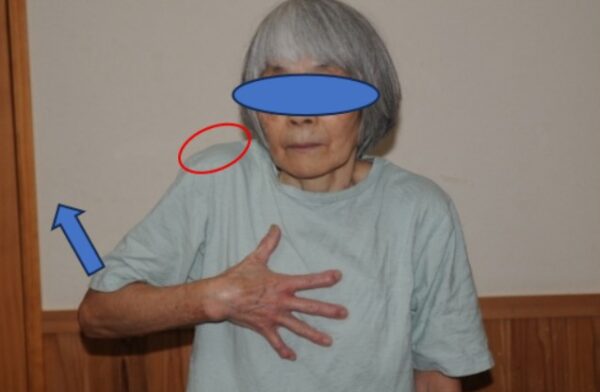 (1)片手を胸に当て肘を外転する(写真1)