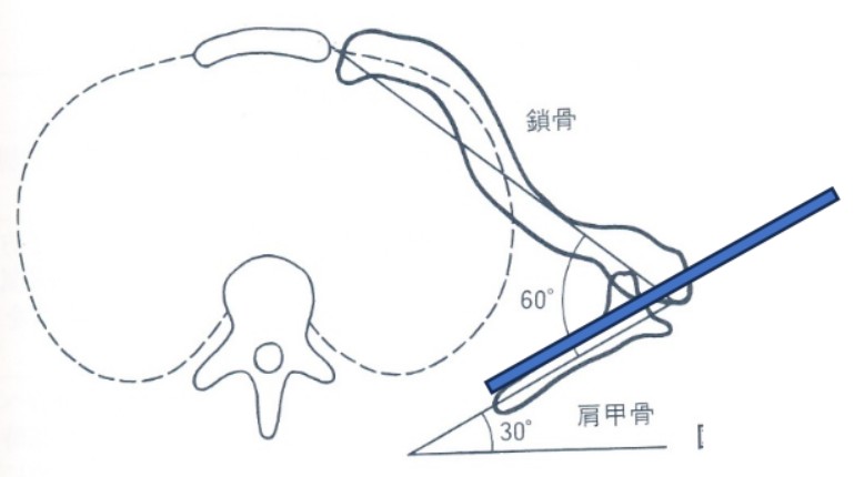 肩甲骨は丸みがかった胸郭の上に乗っているため体の前額面に対して約30°~40°傾いている。この面をスキャプラプレーン(Scapular plane)「肩甲骨面」「肩甲平面」という(図2、3)。図2は頭の上から肩甲骨と鎖骨を見たものです。
